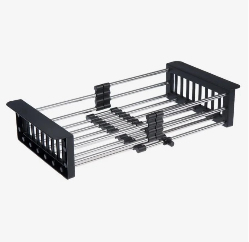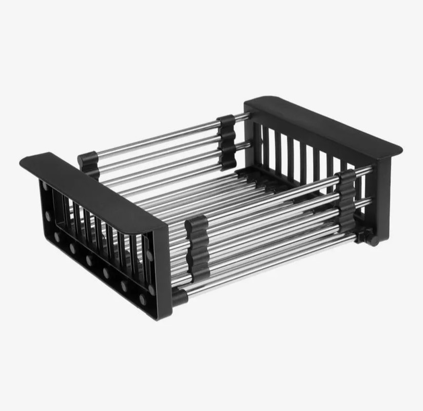 Корзина из нержавеющей стали на кухонную мойку раздвижная для сушки столовых приборов , овощей и фруктов. Габаритные размеры: ширина 225 мм, длина от 310 до 440 мм.Вес - 0,650 кг. Подходит для квадратных моек