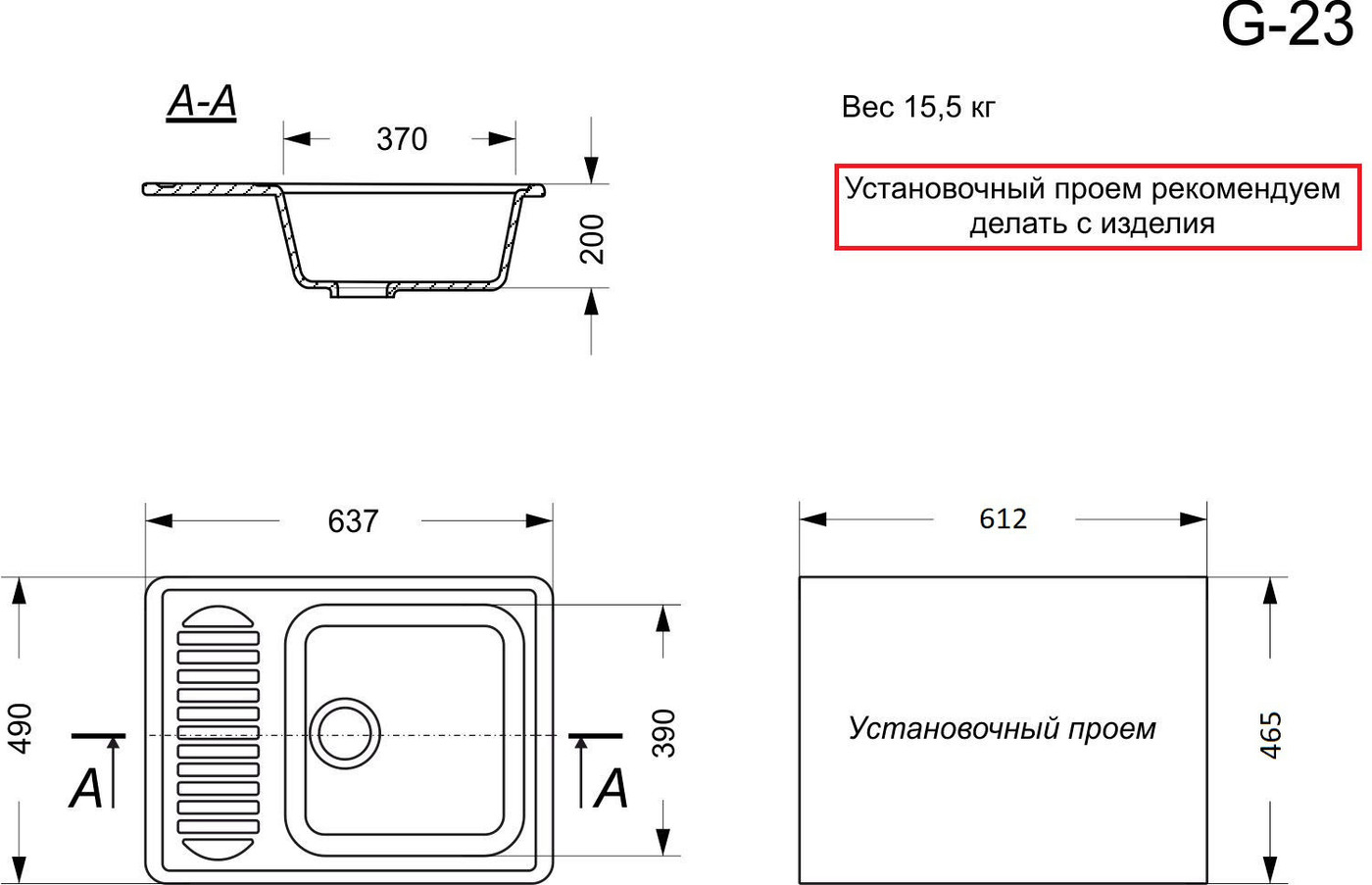- Установочный проем: 612х465 мм