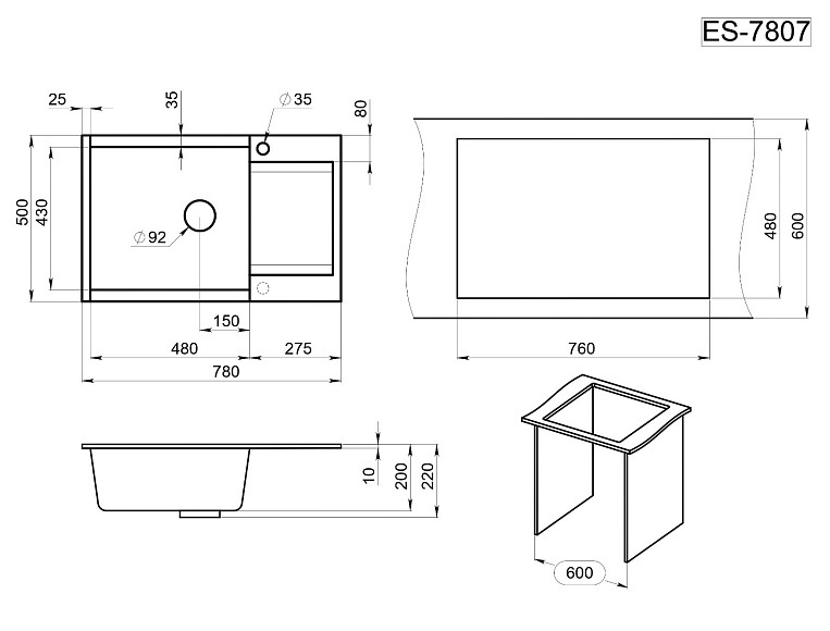 ТОЛЬКО ПОД ЗАКАЗ! Кухонная мойка ESTETICA ES-7807, кварц