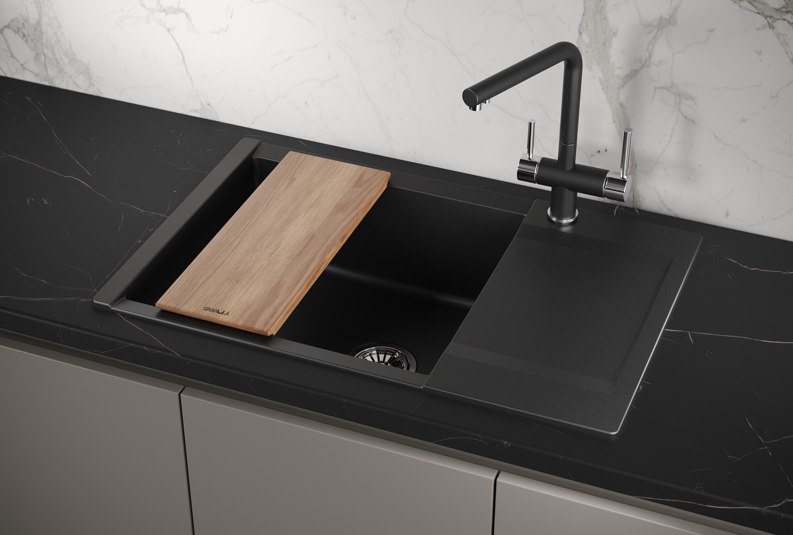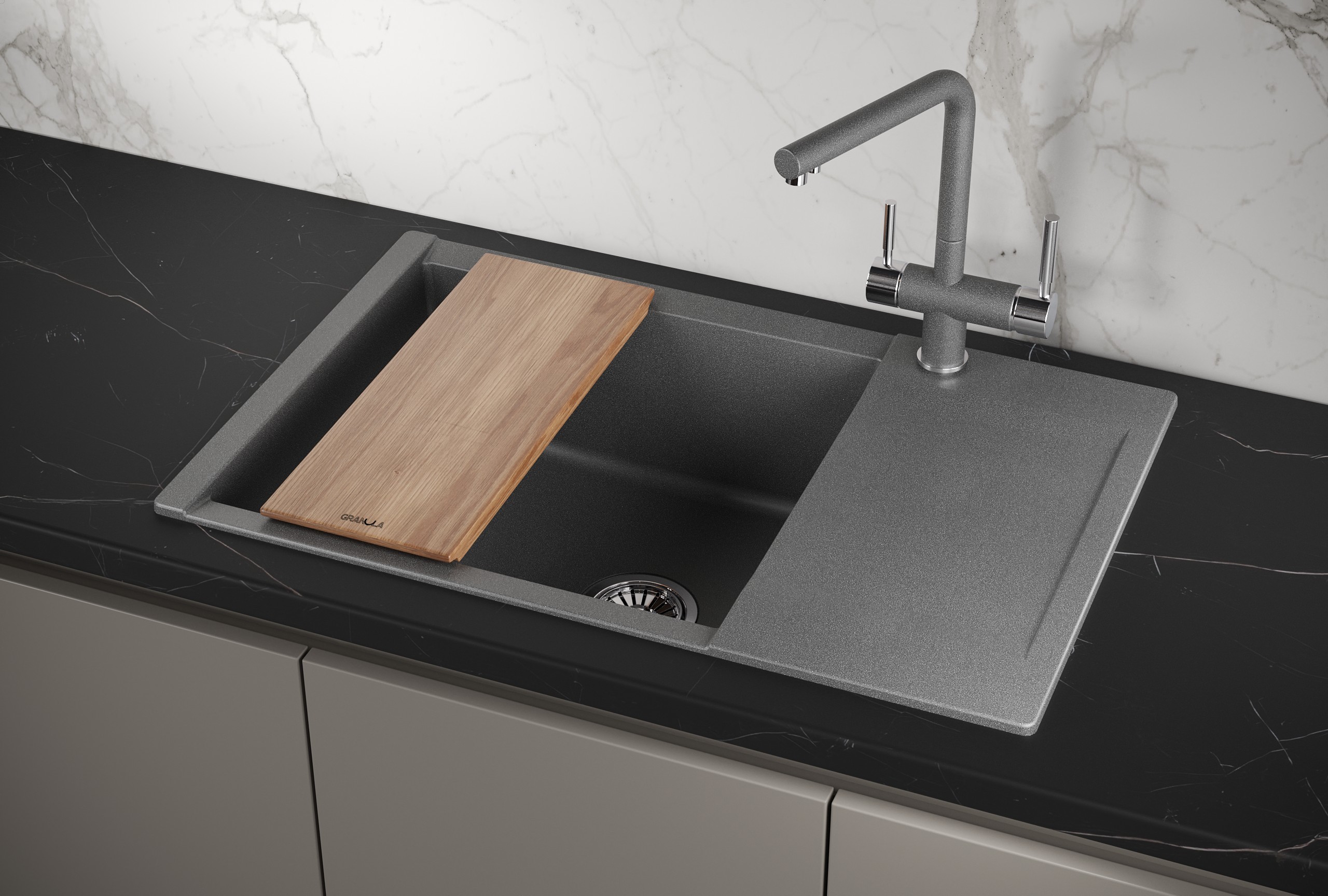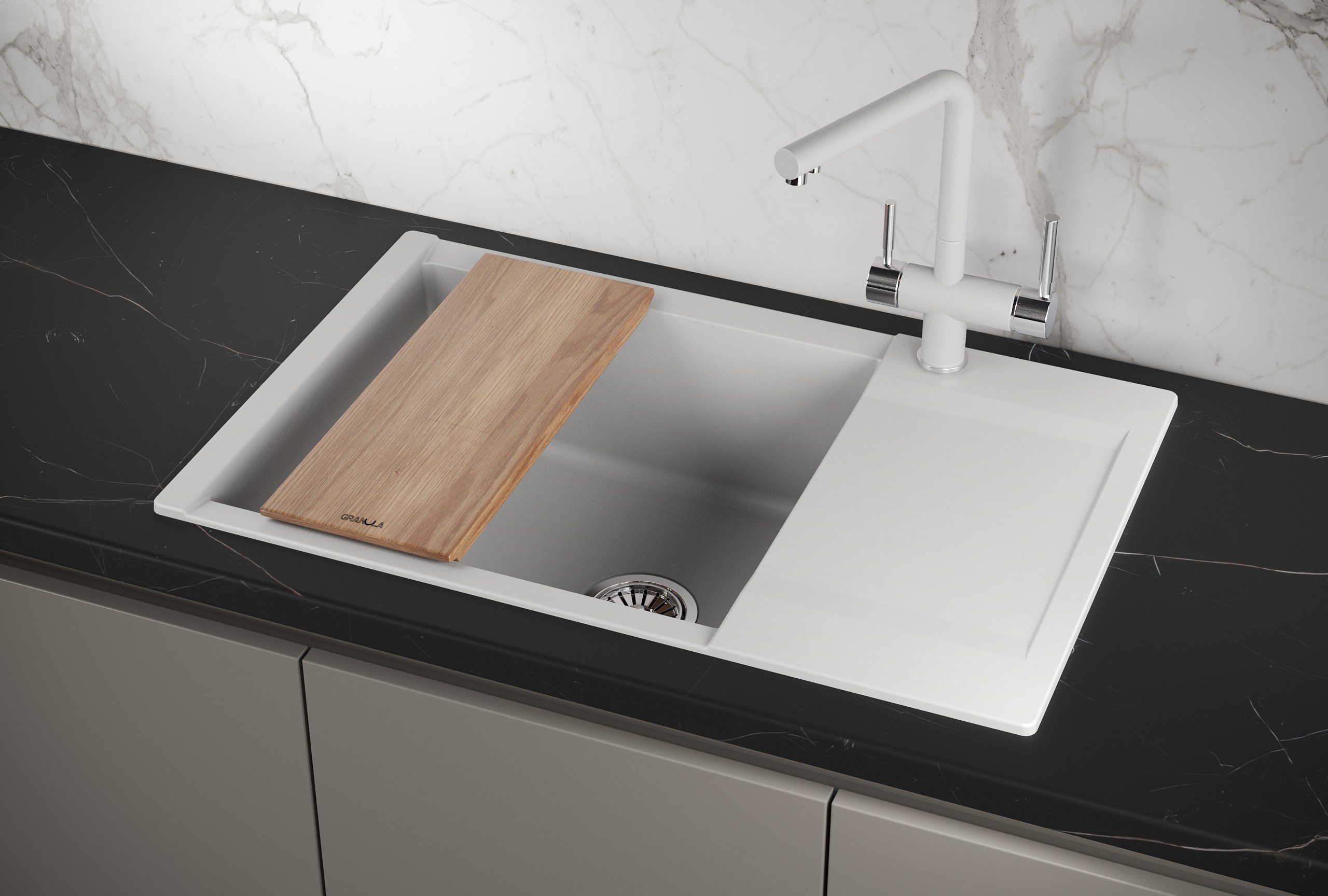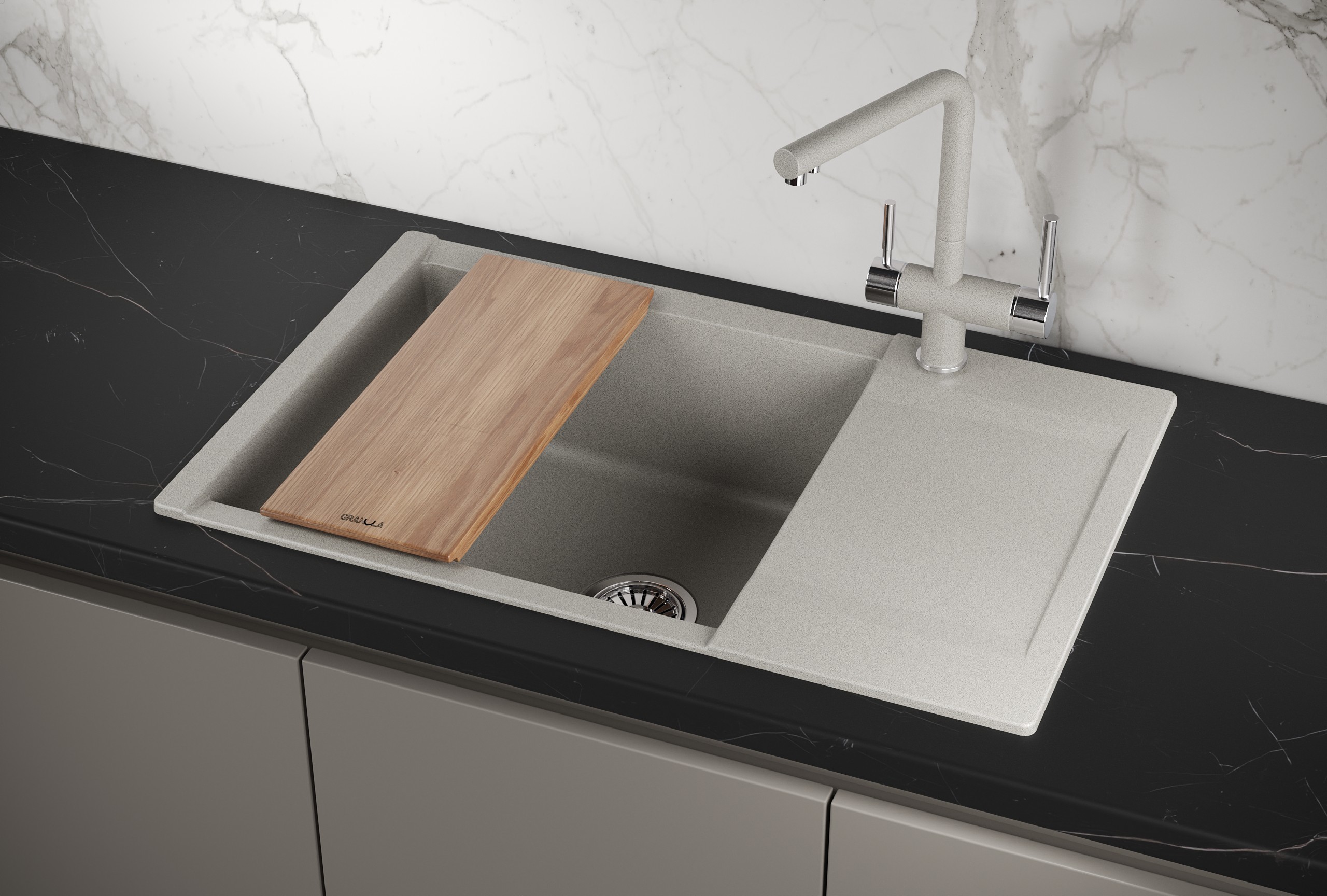 В комплект входит элегантная деревянная разделочная дощечка из ясеня и практичный сифон с прямоугольным переливом, предотвращающим возможные затопления. Корпус изделия изготовлен из прочного кварцевого материала, способного сохранять свой первоначальный вид на протяжении многих лет даже при постоянной эксплуатации во влажной среде. Прямоугольная форма мойки с практичным крылом обеспечивает максимальный комфорт и удобство в использовании. Эта модель прекрасно подходит для работы с измельчителем пищевых отходов, благодаря чему процесс приготовления пищи становится еще более гигиеничным и приятным. Не упустите свой шанс обновить свою кухню с помощью стильной и надежной кухонной мойки Granula Estetica!