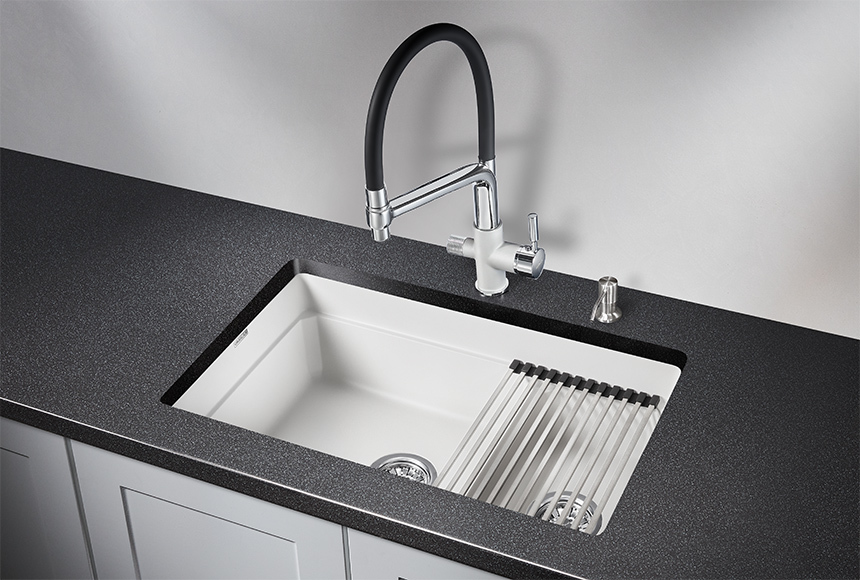 Двухсекционная кварцевая мойка прямоугольной формы предназначена для установки под столешницу в шкаф 800мм. Внутри каждой чаши удобная площадка для установки ролл-мата или разделочной доски. Мойка выполнена из кварцевого композитного материала высокой плотности и гигроскопичности, что обеспечивает не менее 20 лет надежной эксплуатации. Ролл-мат и дозатор из нержавеющей стали идут в комплекте, что делает эту модель еще более удобной и привлекательной. Представлена в 4х цветах.