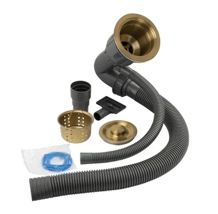 Комплектация: сифон для мойки с переливом, корзина решетка с обратным клапаном, сито. Выпуск для мойки - сливная «корзинка» с диаметром 90 мм снабжена съёмным «ситечком» и крышкой-затвором, которые удобно вынимать для чистки слива. Сифон для мойки и гофра прилагаются, дополнительно не нужно покупать сифон для кухонной мойки.