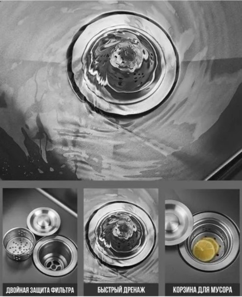 Комплектация: сифон для мойки с переливом, корзина решетка с обратным клапаном, сито. Выпуск для мойки - сливная «корзинка» с диаметром 90 мм снабжена съёмным «ситечком» и крышкой-затвором, которые удобно вынимать для чистки слива. Сифон для мойки и гофра прилагаются, дополнительно не нужно покупать сифон для кухонной мойки.