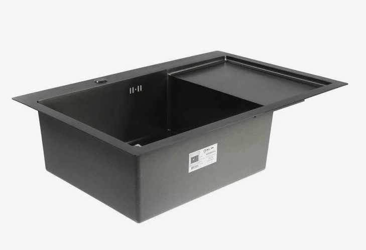 Мойка цвета графит(черная) имеет PVD покрытие, которое обеспечивает дополнительную защиту от бактерий. Мойка для кухни врезная имеет геометрию с небольшим уклоном, позволяющим стекать воде. Присутствуют отверстия для смесителя и диспенсера.