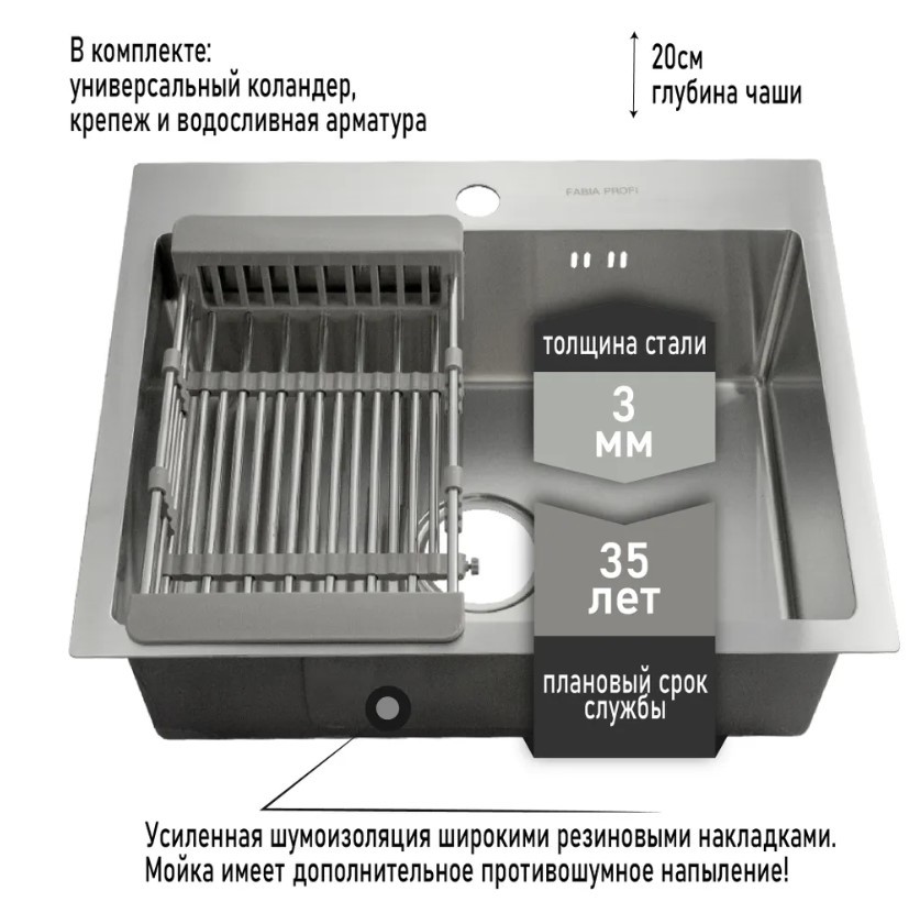 Мойка врезная FABIA PROFI-55453 55х45 см толщина 3,0 х 0,8 мм,глубина 220 мм. Врезная кухонная мойка премиум-класса произведена из премиальной нержавеющей стали AISI304, обладает повышенной прочностью, толщина основания 3,0 мм,чаша 0,8 мм.