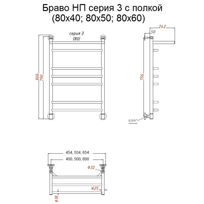 Водяной полотенцесушитель Тругор Браво 3 80х50П, с полкой, хром