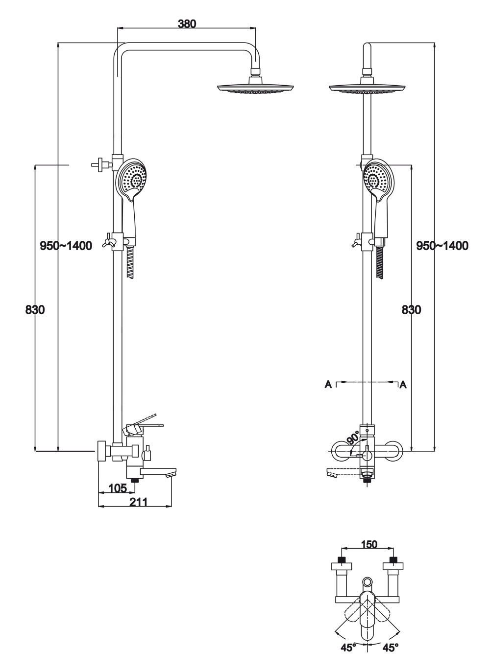 Длина излива верхнего душа (мм): 380