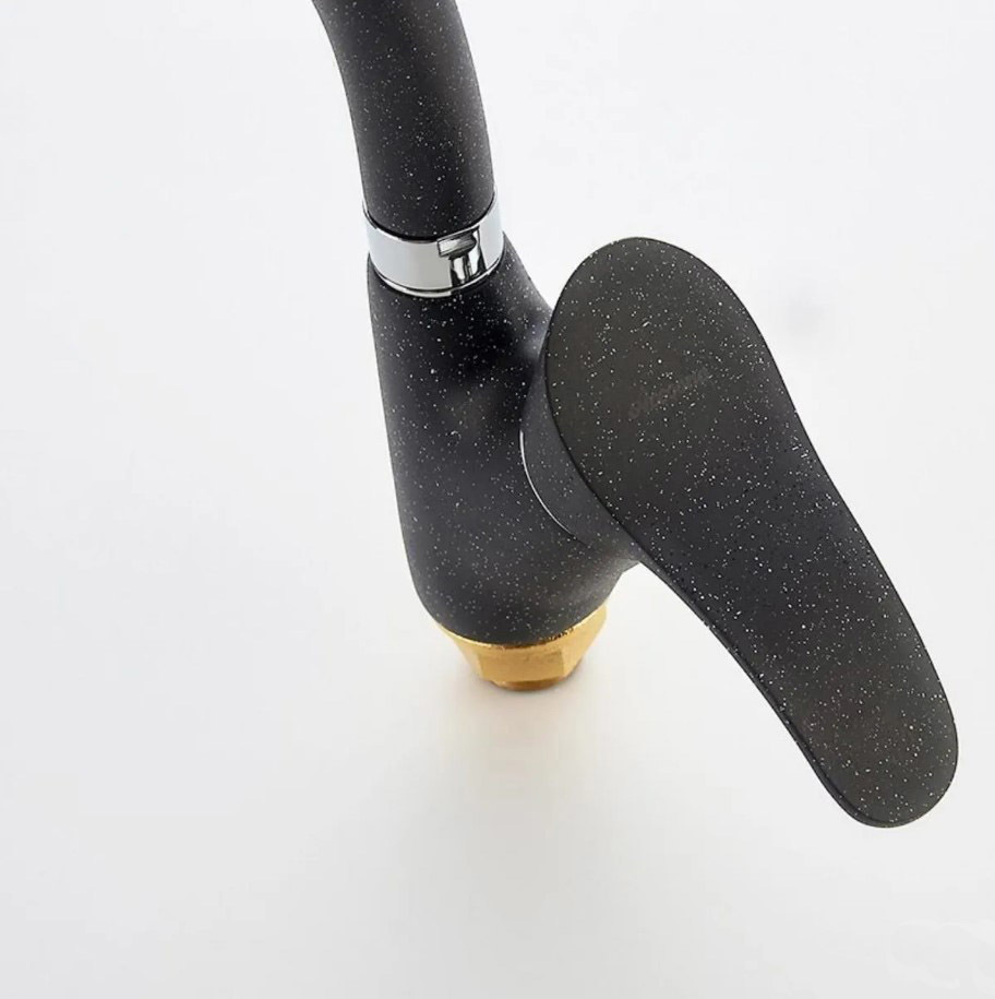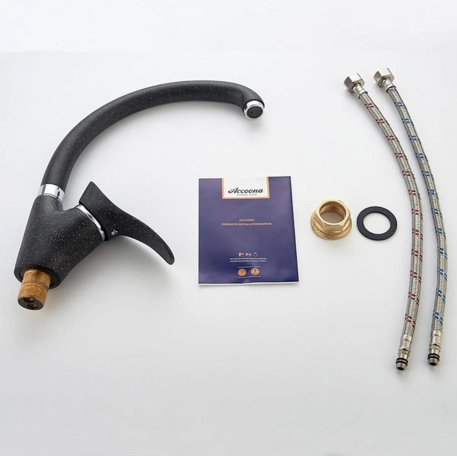 Accoona - уникальное сочетание цены и качества! Однорычажный смеситель для раковины добавит элегантности вашей кухне! Смеситель для кухни Accoona с чёрным матовым покрытием прекрасно будет выглядеть на мойке из искусственного гранита светлого цвета. Компоненты кухонного смесителя выполнены из латуни - прочного материала, который гарантирует герметичность корпуса в течение многих лет. Надежный керамический картридж обеспечивает исключительную долговечность: ресурс картриджа не менее 500 000 переключений. Керамическое покрытие кухонного смесителя, обеспечивает исключительную долговечность, а также гладкую структуру поверхности, которая предотвращает рост микроорганизмов и легко поддерживается в чистоте. Сильный напор струи. Отлично подойдет для глубоких и больших раковин. Кухонный смеситель вращается на 360 градусов. Быстрая и легкая (до 30 минут) установка.