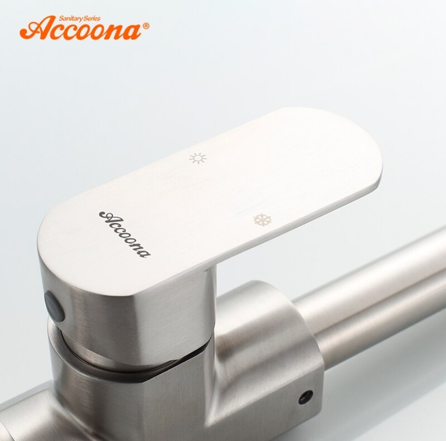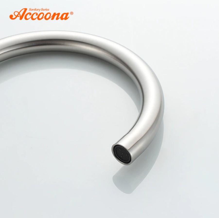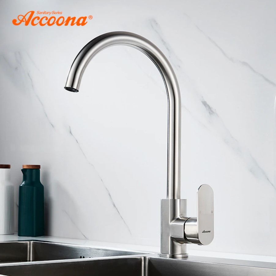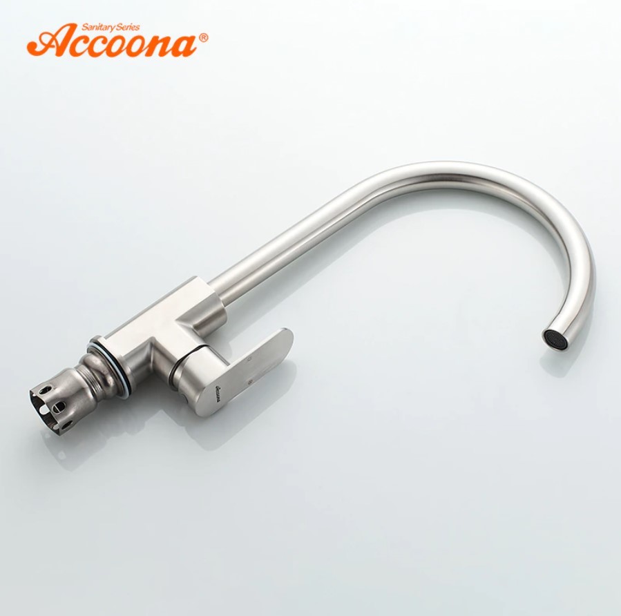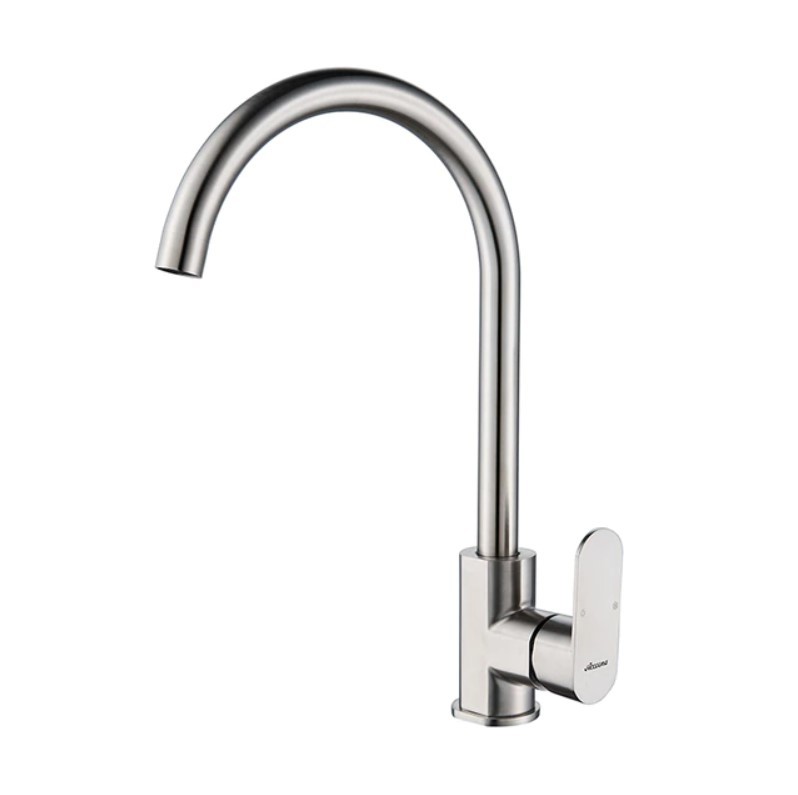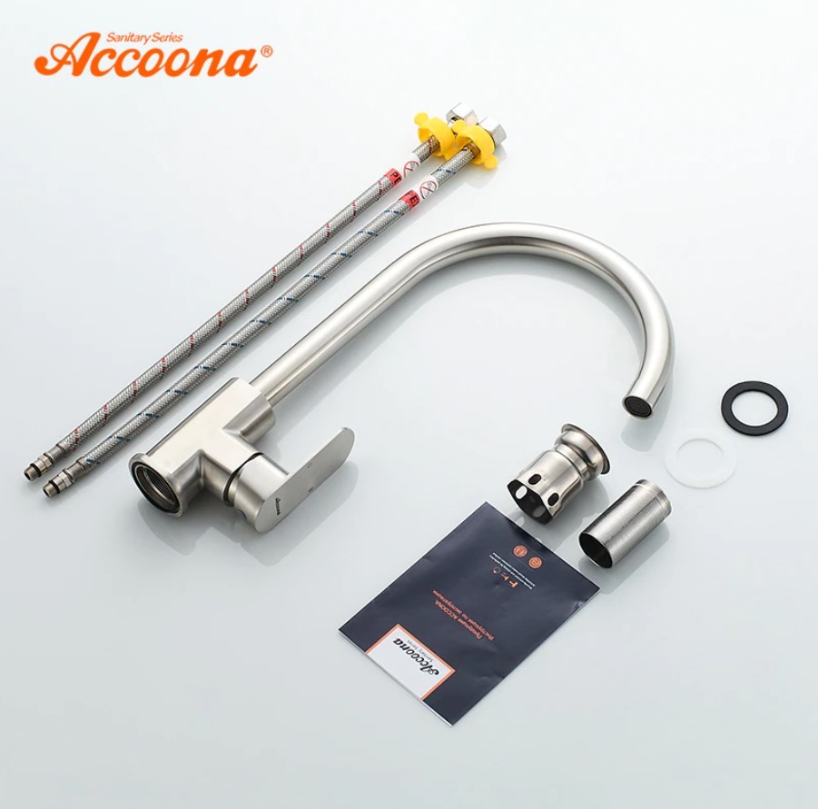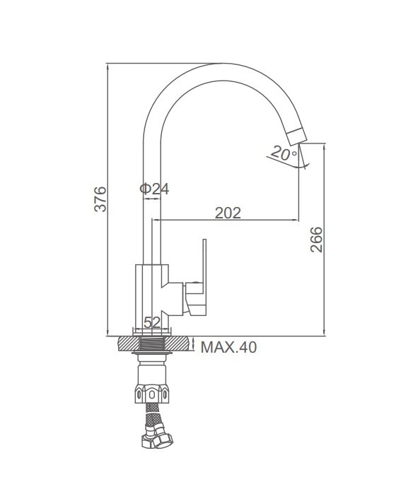 Смеситель для мойки монокомандный. Монтаж на одно отверстие прижимной гайкой. Корпус смесителя изготовлен из цинка. Излив - 202 мм из нержавеющей стали. Гибкая подводка 35 см из нержавейки. Комплект крепежа.