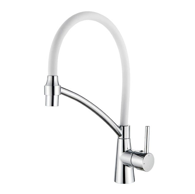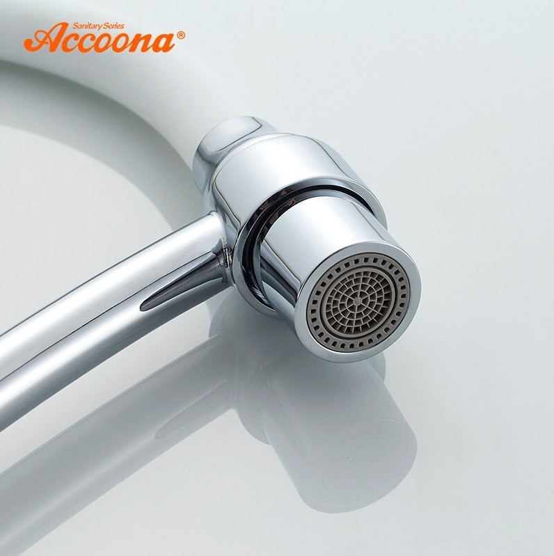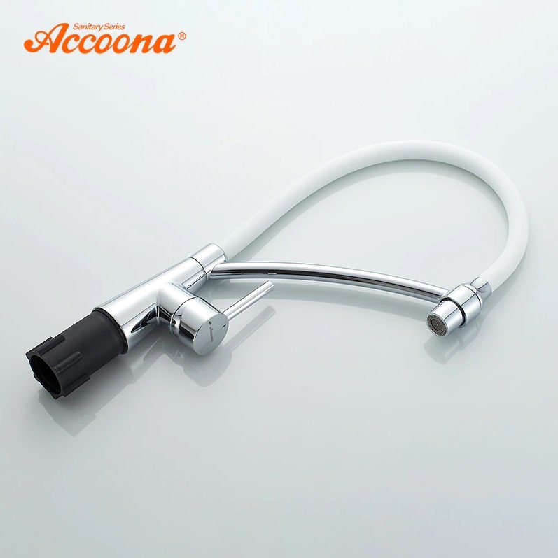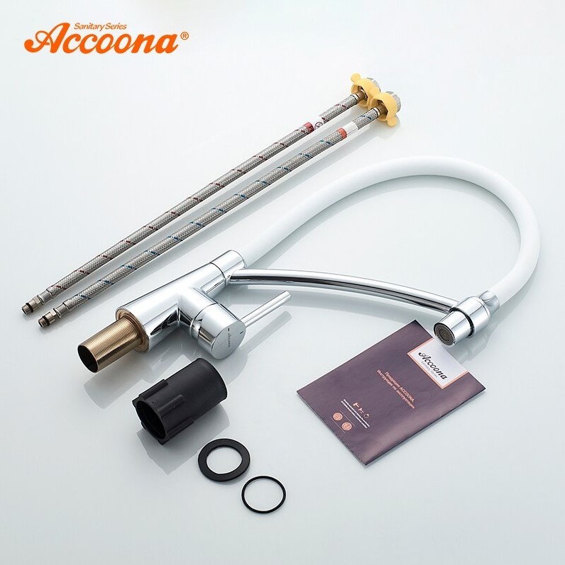 Смеситель для кухни с латунным корпусом и силиконовым изливом, однорычажный. Цвет:хром/белый. Излив можно изогнуть на 360 градусов. Излив имеет два режима: обычный поток и душ. В комплекте подводка для воды. Высокое качество хром-никелевого покрытия. Производство товаров под брендом Accoona является крупной корпорацией, специализирующейся на выпуске сантехнической продукции: высококачественных смесителей и их комплектующих, а также аксессуаров для ванны. Корпорация Accoona самостоятельно проектирует и производит свою продукцию. Продукция изготовлена на оборудовании из Италии, Германии, Испании. Высококачественная продукция имеет хороший отзыв у покупателей.Компания работает над усовершенствованием первого класса марки, чтобы удовлетворить клиентов качеством продукции. Марка Accoona имеет признание и пользуется спросом на мировом рынке.