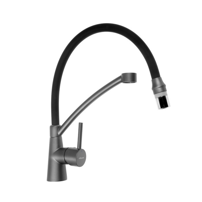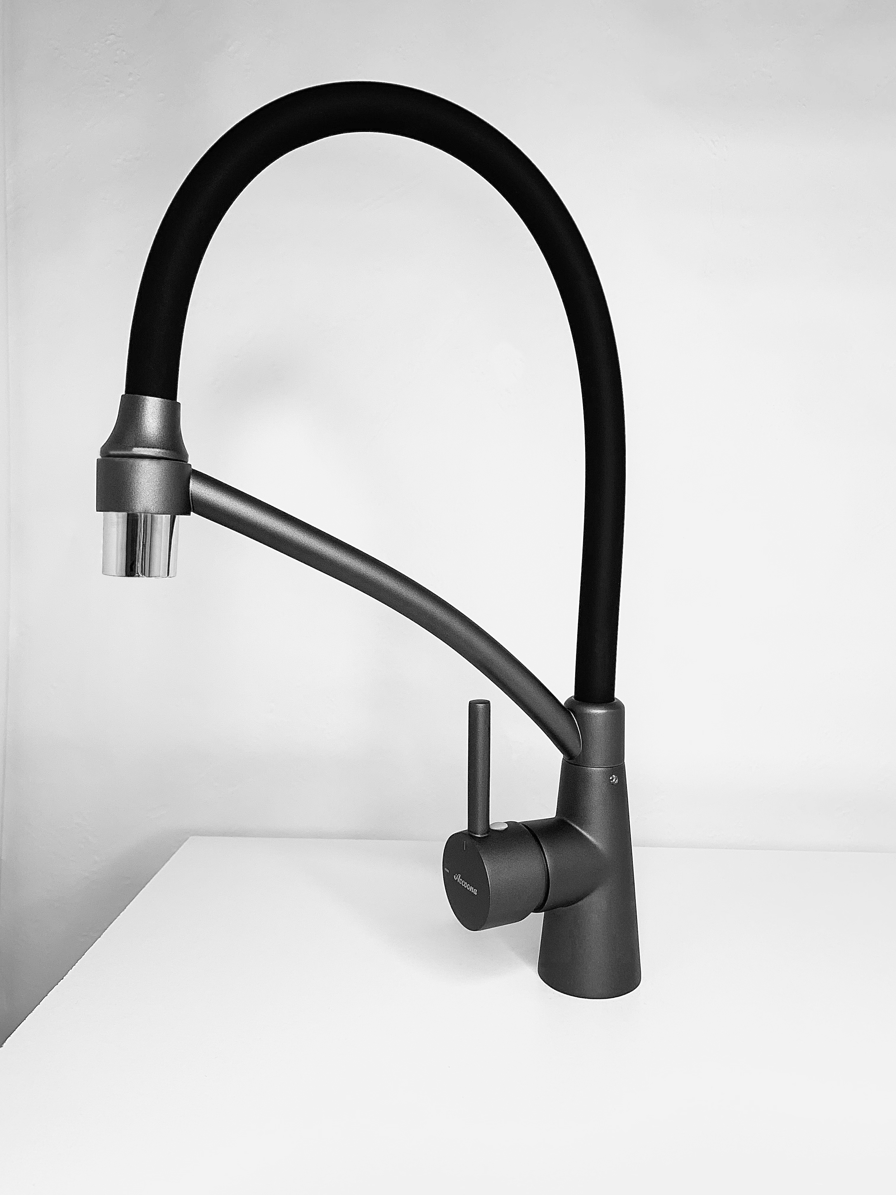 Смеситель для кухни с латунным корпусом и силиконовым изливом, однорычажный. Цвет: графит/чёрный. Излив можно изогнуть на 360 градусов. Излив имеет два режима: обычный поток и душ. В комплекте подводка для воды. Высокое качество хром-никелевого покрытия. Производство товаров под брендом Accoona является крупной корпорацией, специализирующейся на выпуске сантехнической продукции: высококачественных смесителей и их комплектующих, а также аксессуаров для ванны. Корпорация Accoona самостоятельно проектирует и производит свою продукцию. Продукция изготовлена на оборудовании из Италии, Германии, Испании. Высококачественная продукция имеет хороший отзыв у покупателей.Компания работает над усовершенствованием первого класса марки, чтобы удовлетворить клиентов качеством продукции. Марка Accoona имеет признание и пользуется спросом на мировом рынке.