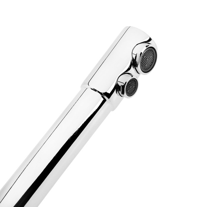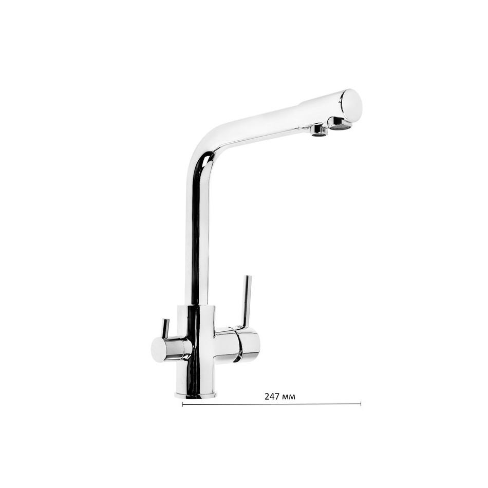 Однорычажный смеситель с длинным высоким изливом устанавливается на мойку. К сантехнике возможно подключение фильтра для подачи питьевой воды. Напор очищенной жидкости регулируется отдельным рычагом. Модель оснащена дополнительным герметичным затвором, благодаря которому струи проточной и фильтрованной воды не перемешиваются.