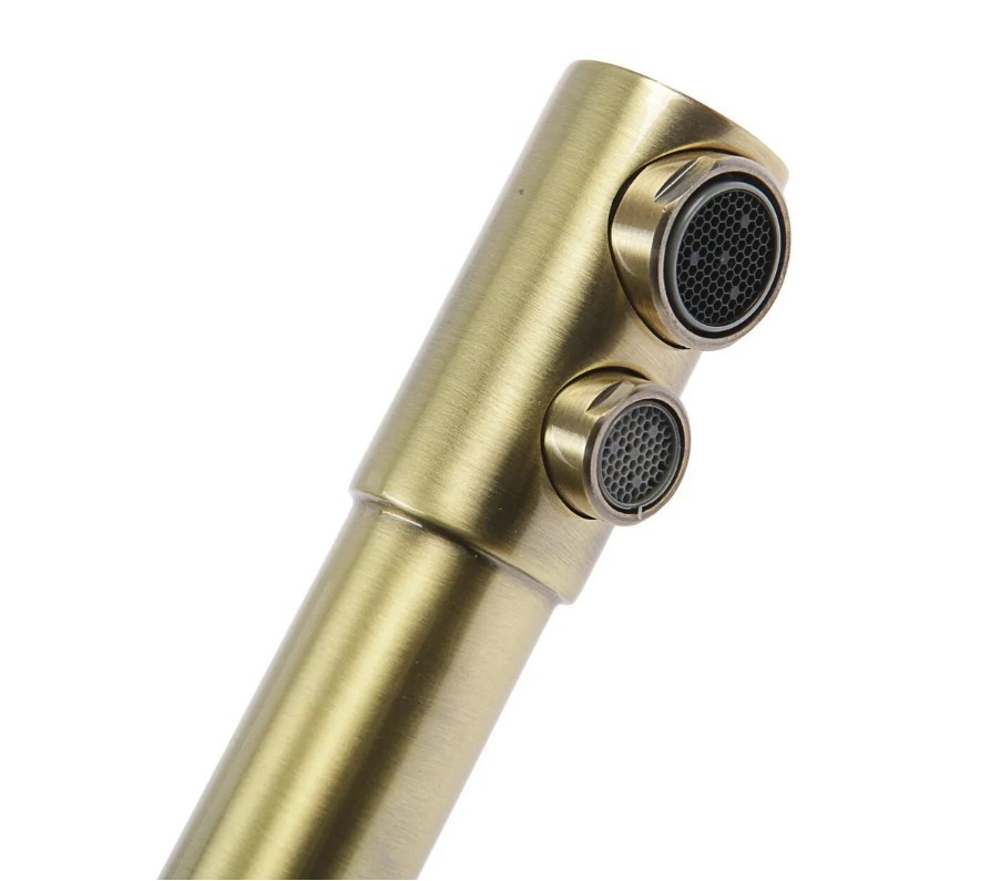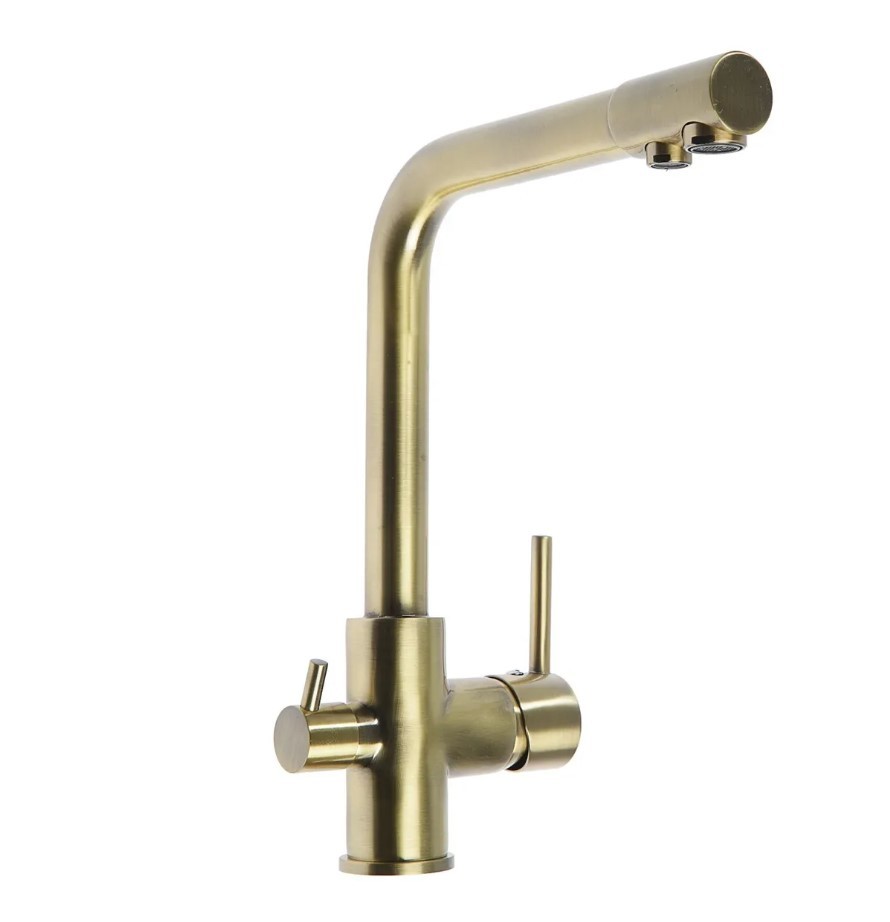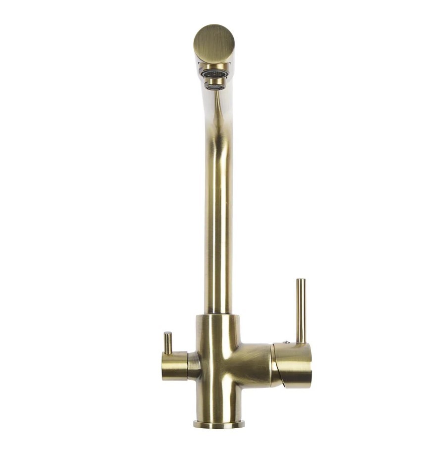 Однорычажный смеситель с длинным высоким изливом устанавливается на мойку. К сантехнике возможно подключение фильтра для подачи питьевой воды. Напор очищенной жидкости регулируется отдельным рычагом. Модель оснащена дополнительным герметичным затвором, благодаря которому струи проточной и фильтрованной воды не перемешиваются.