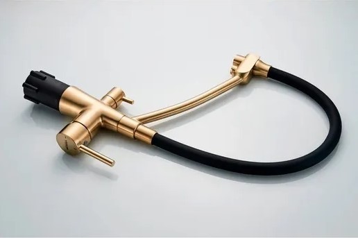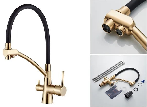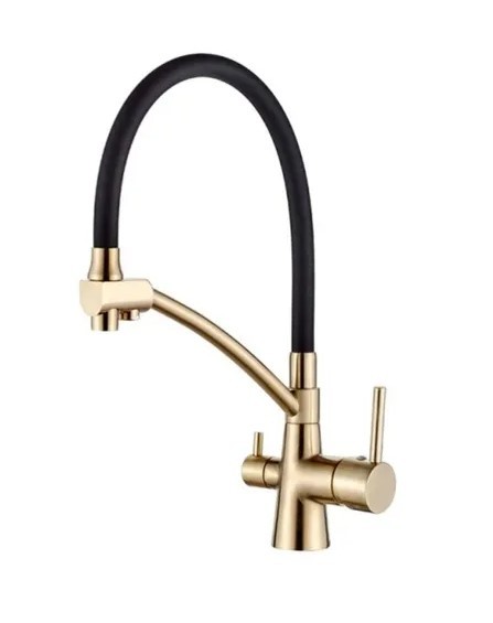 Смеситель кухонный с гибким изливом с подводом чистой воды. Цвет: бронза/чёрный. Гибкий излив-силиконовый шланг, корпус смесителя-латунь. Ручка включения водопроводной воды расположена под углом 45 градусов, что позволяет монтировать смеситель максимально близко к стене. Отлично сочетается с кухонными мойками подстольного монтажа,где место крепления смесителя ограничено. Кран представляет собой два независимых смесителя в одном: водопроводный кран и смеситель под фильтрованную воду. Подвод фильтрованной воды осуществляется благодаря белому переходнику, идет в комплекте со смесителем Напор очищенной жидкости регулируется отдельным рычагом. Модель оснащена дополнительным герметичным затвором, благодаря которому струи проточной и фильтрованной воды не перемешиваются.