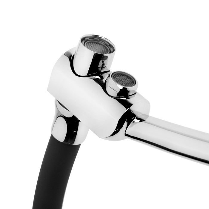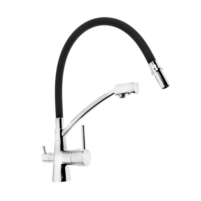 Смеситель кухонный с гибким изливом с подводом чистой воды. Цвет: хром/чёрный. Гибкий излив-силиконовый шланг, корпус смесителя-латунь. Ручка включения водопроводной воды расположена под углом 45 градусов, что позволяет монтировать смеситель максимально близко к стене. Отлично сочетается с кухонными мойками подстольного монтажа,где место крепления смесителя ограничено. Кран представляет собой два независимых смесителя в одном: водопроводный кран и смеситель под фильтрованную воду. Подвод фильтрованной воды осуществляется благодаря белому переходнику, идет в комплекте со смесителем Напор очищенной жидкости регулируется отдельным рычагом. Модель оснащена дополнительным герметичным затвором, благодаря которому струи проточной и фильтрованной воды не перемешиваются.
