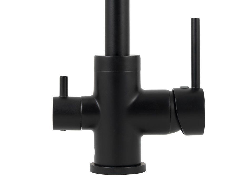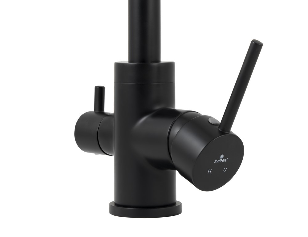Смеситель Kaiser 26744-9 из коллекции Merkur с подключением под фильтр. Смеситель имеет сдвоенный аэратор, внутри излива проходит трубка для фильтрованной воды, что исключает возможность смешивания с проточной водой. Для подачи питьевой воды на корпусе смесителя размещен рычаг. Преимущество совмещенных смесителей заключается в том, что не нужно делать дополнительных отверстий на мойке и устанавливать отдельный кран для питьевой воды.