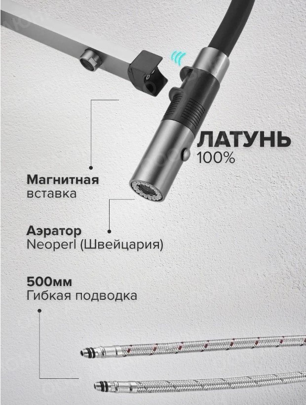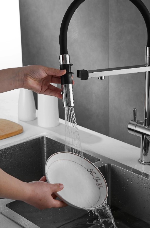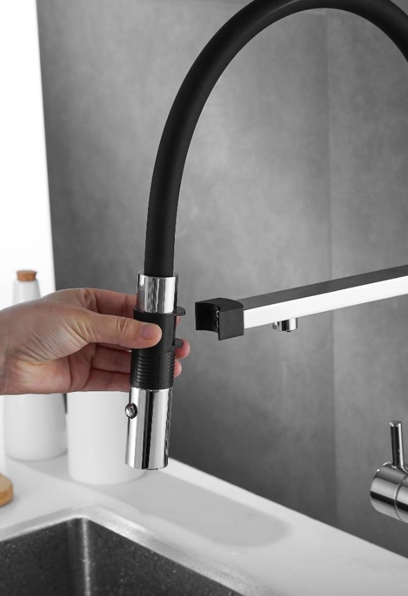 Смеситель для кухни с фильтром для питьевой воды (фильтр приобретается отдельно) гибким изливом и магнитным держателем (магнитная вставка) Rose J2070 ХРОМ / ЧЁРНЫЙ.
