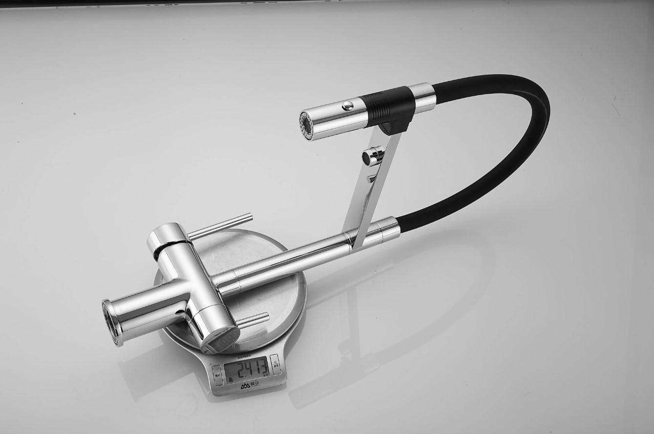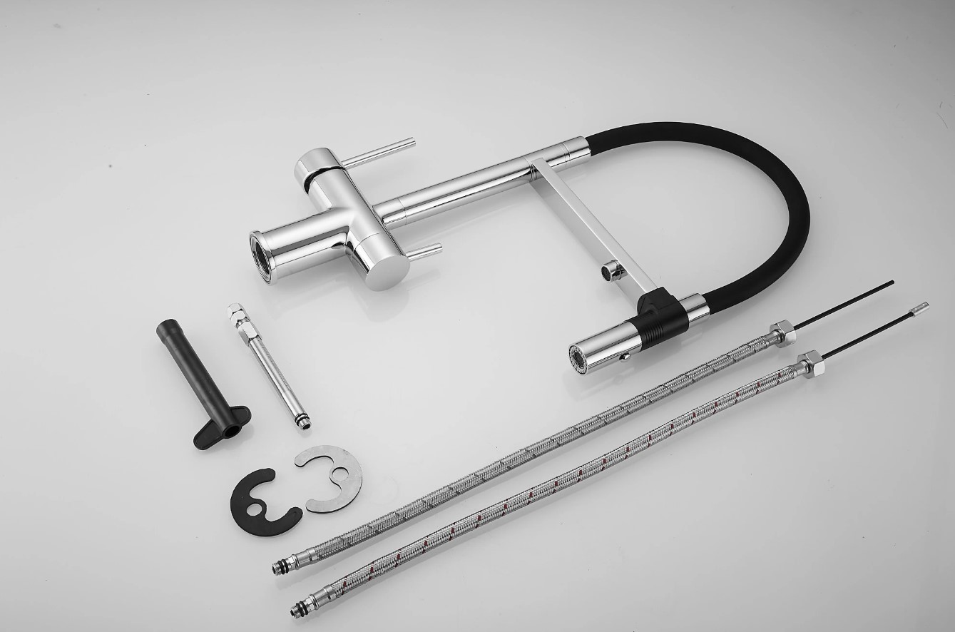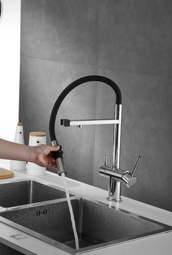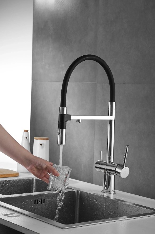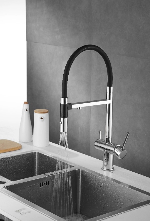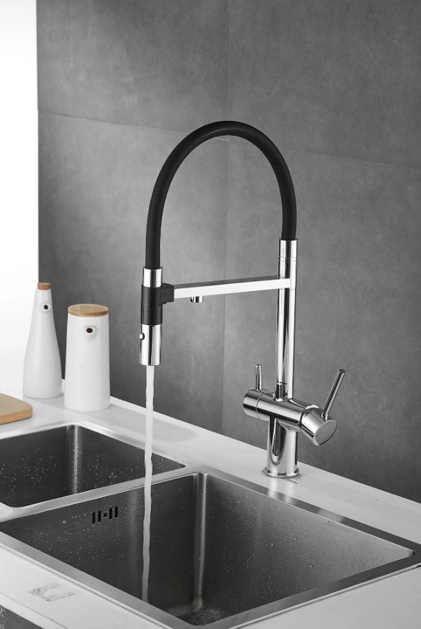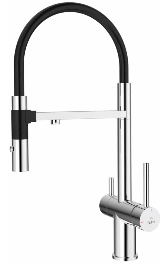 Смеситель для кухни Rose J2070 ХРОМ с чёрным гибким изливом и подключением к фильтру питьевой воды
