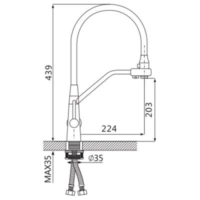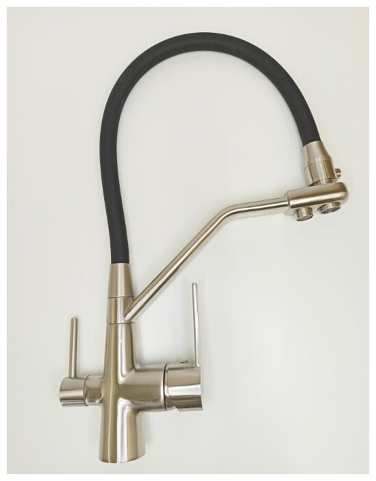 Смеситель для кухни с гибким изливом OUTE P4030-MCF Сатин/чёрный, одна рукоять для регулировки воды. Такие Сантехнические приборы имеют встроенный фильтр, который очищает воду. Обычно модели имеют специальный переключатель, который позволяет выбирать, какую воду вам необходимо получить – фильтрованную или обычную. Аэратор обеспечит равномерный поток воды, по причине того, что сеточка рассеивает напор, вода смягчается. Также сеточка отфильтрует примеси и позволит сэкономить около пяти кубов воды в год. Этот тип смесителей отличается наиболее простым видом установки, когда прибор фиксируется на столешнице или раковине с помощью гайки. Она очень надежно прижимает его к поверхности, закручиваясь с другой стороны монтажного отверстия. Современные смесители – объединение классического конструкционного решения и смелого и необычного оформления. Такая сантехника отлично подходит для тех, кто стремится шагать в ногу со временем. Материал данного прибора - латунь, это надежный материал, который обеспечивает идеальное напыление хромированного покрытия. Прибор обычной округлой формы. Самая главная особенность данного прибора – гибкий излив, обладающий эффектом памяти. Благодаря этому вы можете двигать смеситель в различных направлениях, а он будет сохранять заданное положение. В данном приборе излив имеет возможность вращения, что повышает функциональность. Установка модели выполняется на одно отверстие под смеситель.